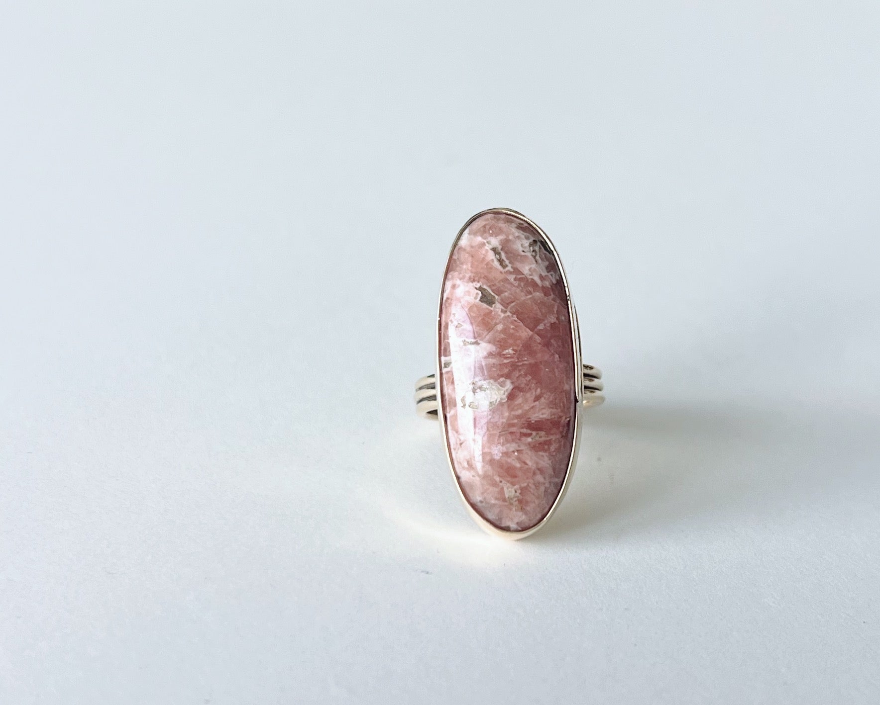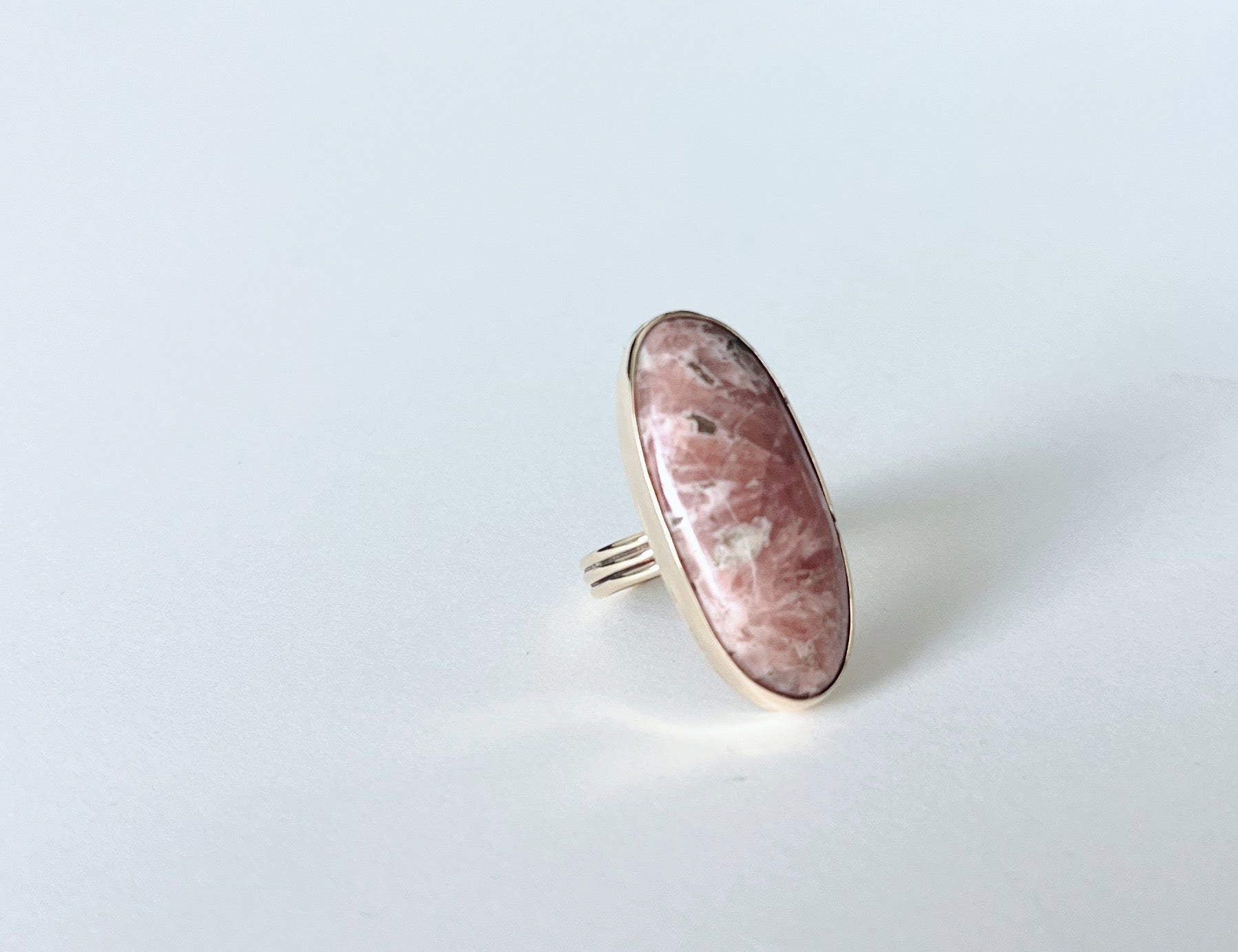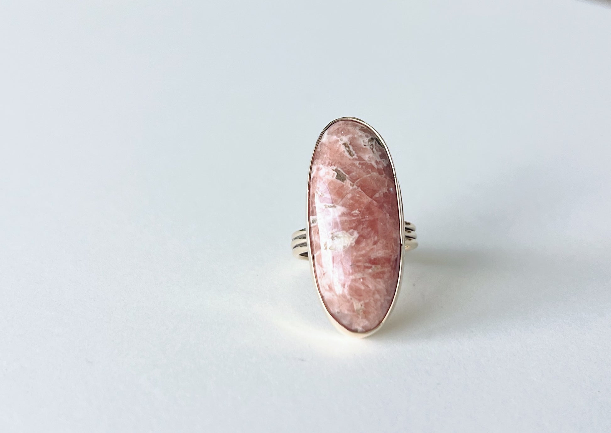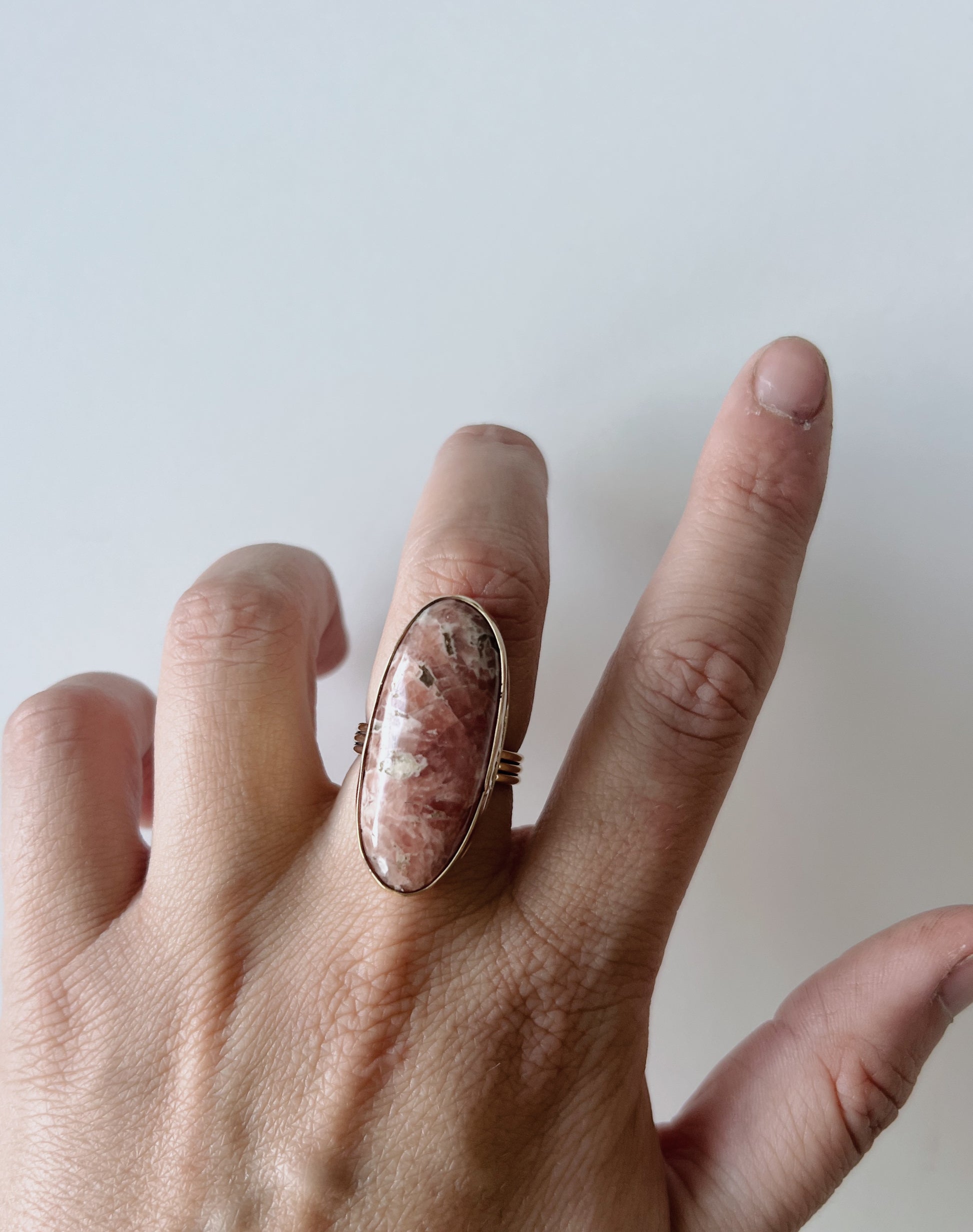Oval rhodochrosite stone set into brass ring. Size 8.