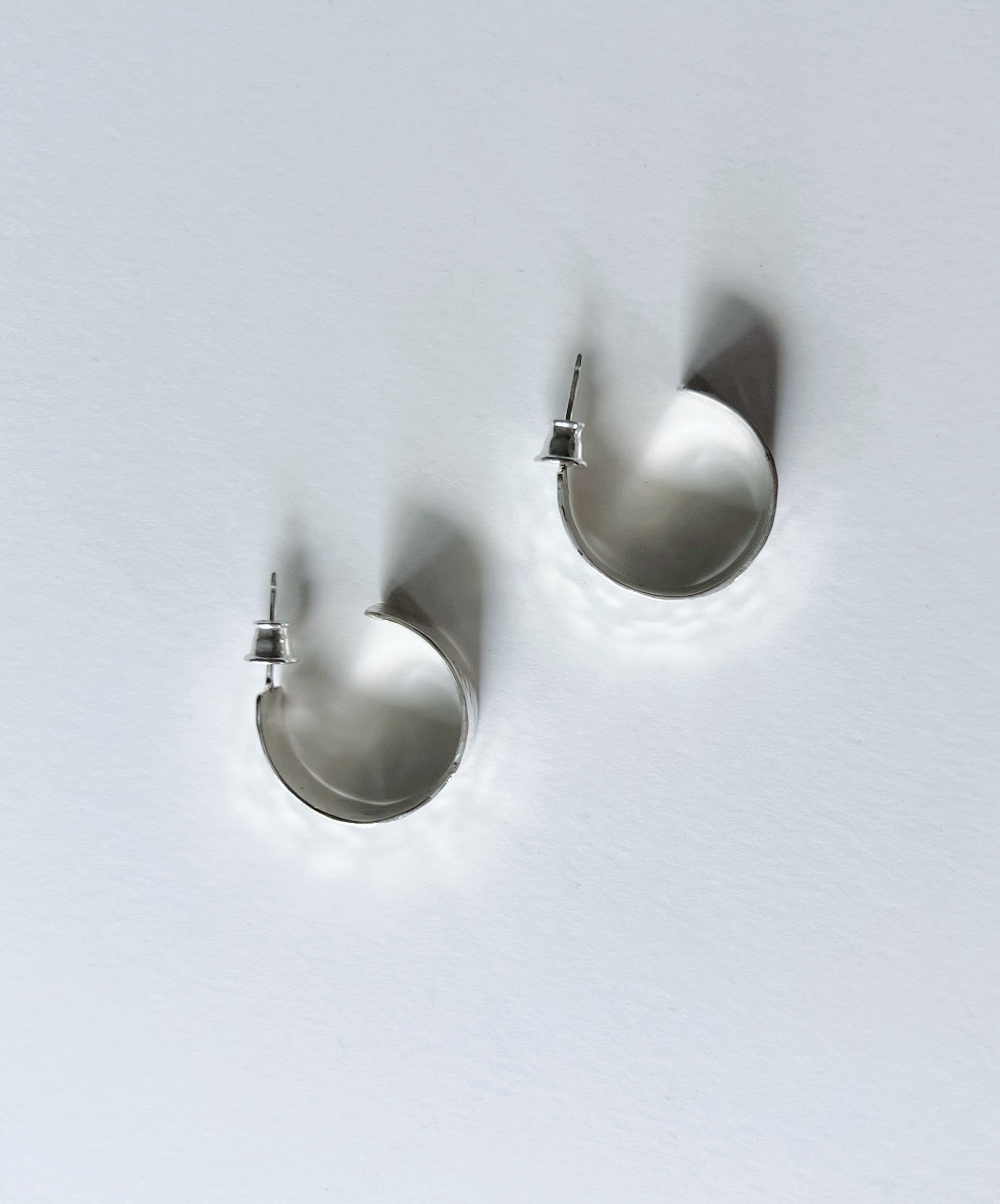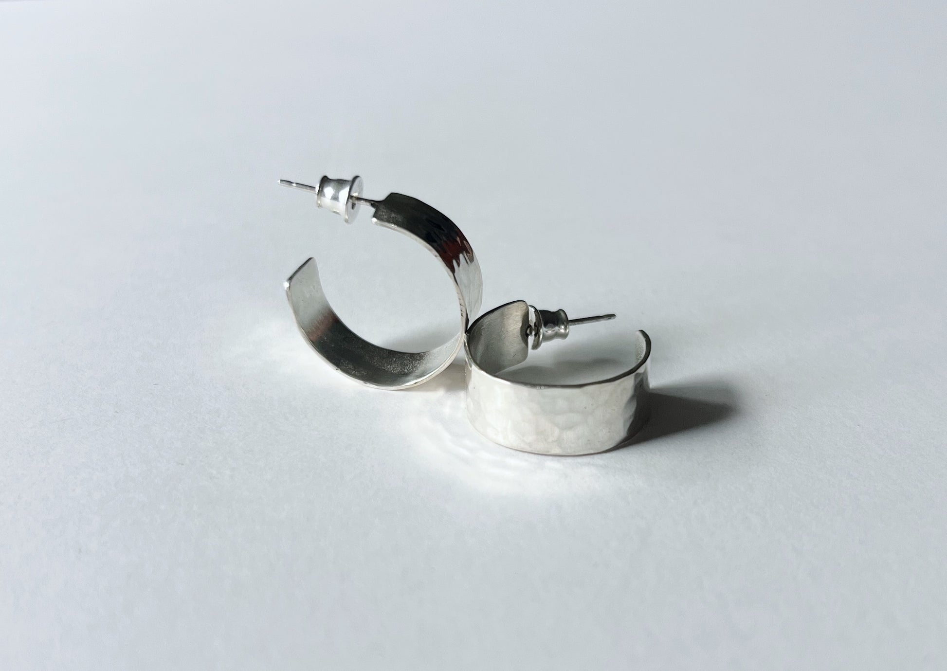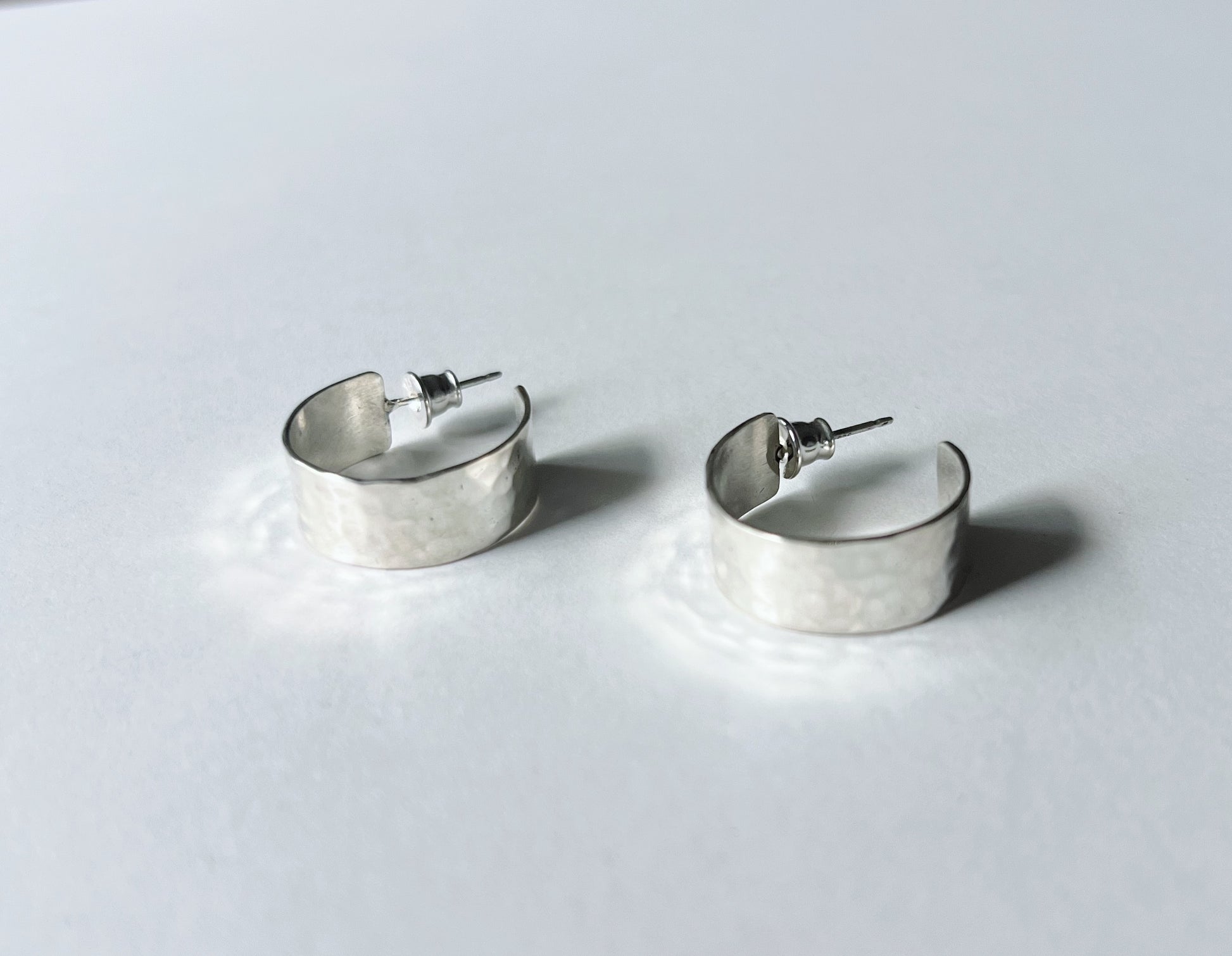Sterling silver hammered hoops, a half centimeter thick with sterling silver posts and earring backs.